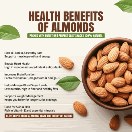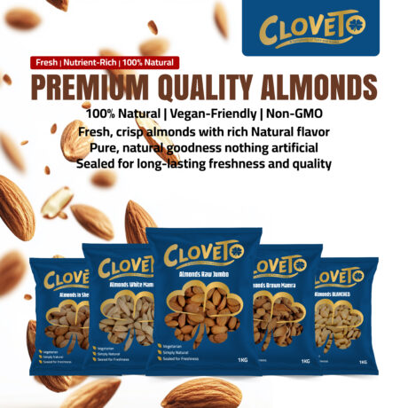 Experience the perfect blend of taste and health with Cloveto Almonds. Carefully selected for superior freshness, rich texture, and natural goodness. Ideal for daily snacking, cooking, or gifting.