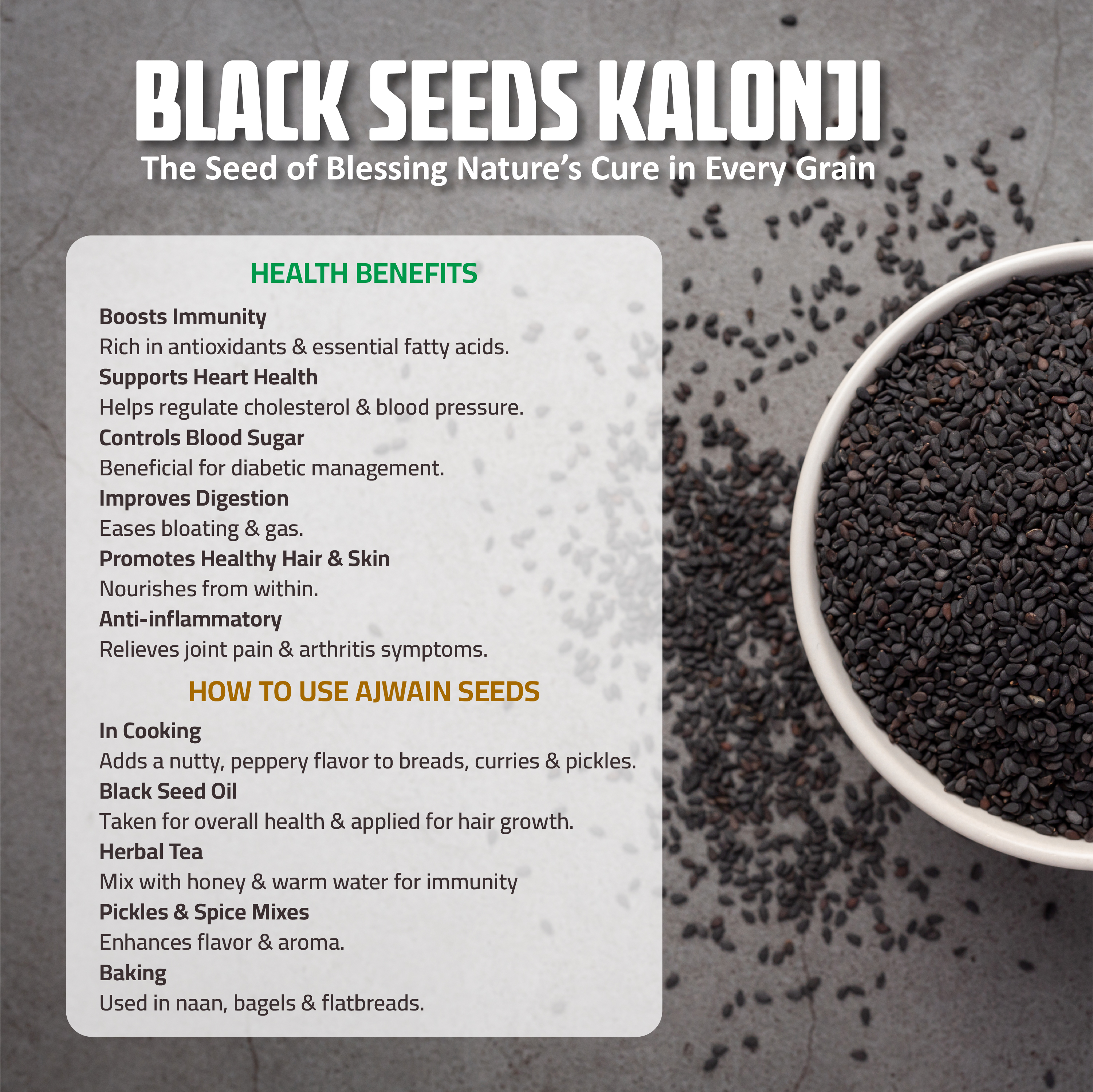 • Premium Black Seeds (Kalonji) – Fresh, aromatic, and nutrient-rich.
