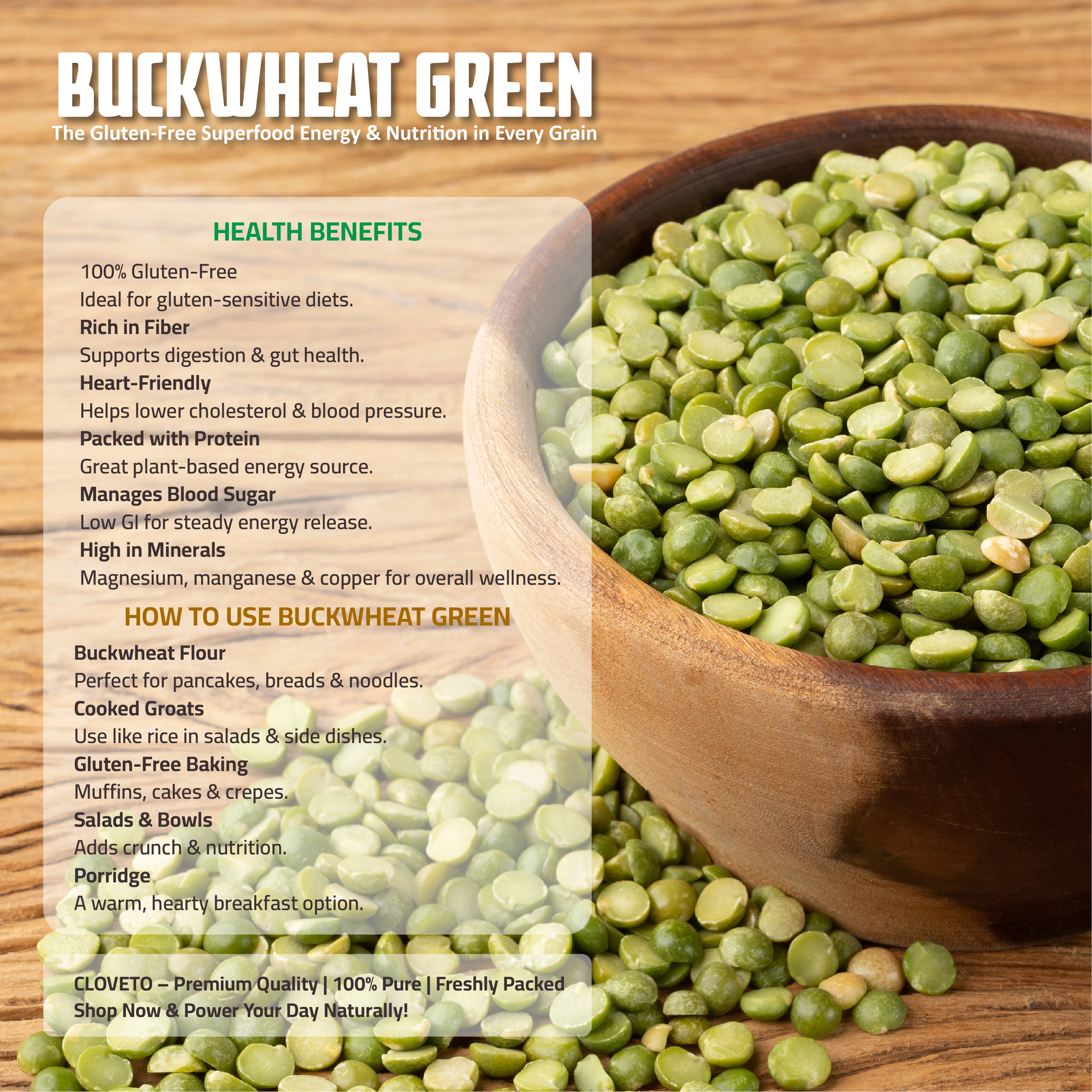 Discover the wholesome benefits of CLOVETO Green Buckwheat, a naturally gluten-free and nutrient-packed grain. Known for its mild, nutty flavor and high protein, fiber, and antioxidant content, green buckwheat is perfect for salads, porridge, smoothies, baking, and healthy snacks.
