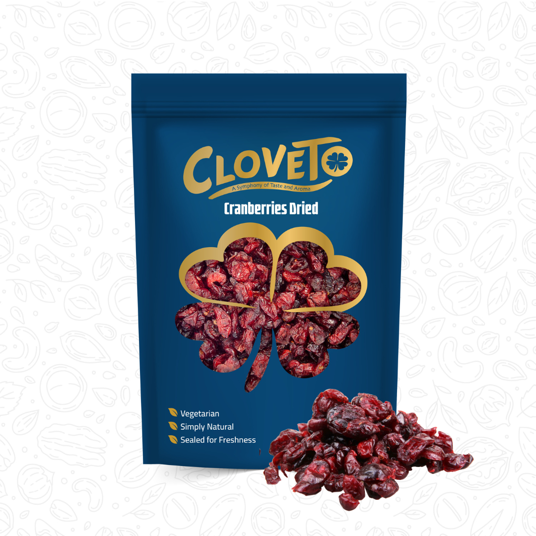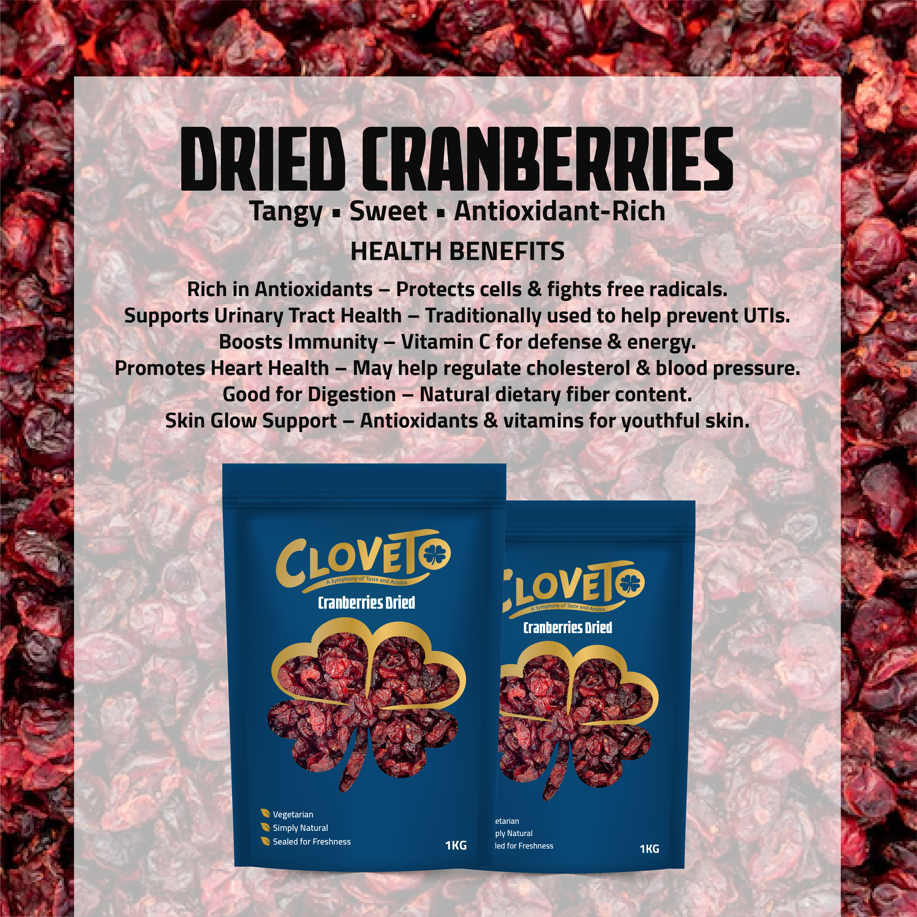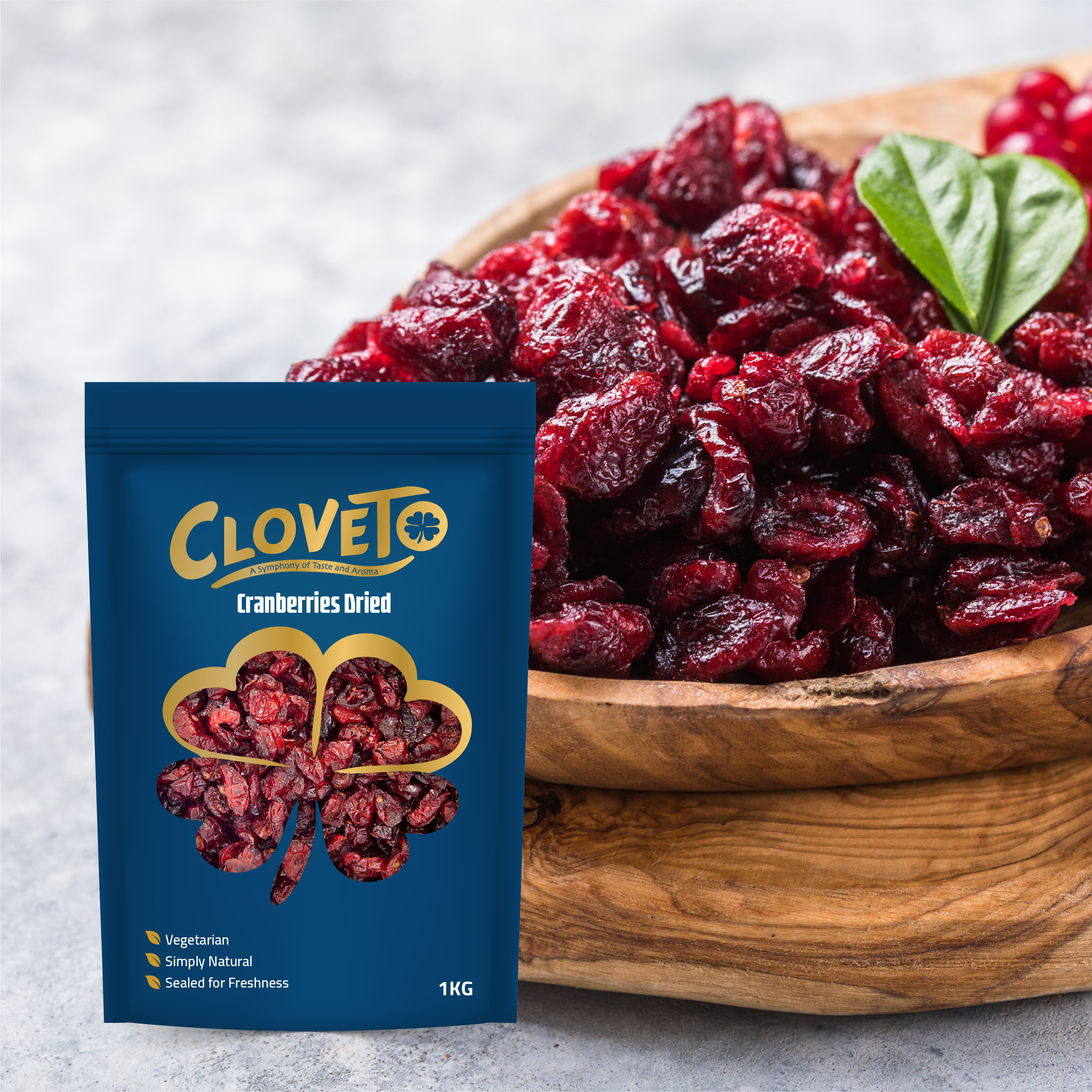 Discover the irresistible flavor of CLOVETO Premium Dried Cranberries, carefully selected and gently dried to preserve their juicy texture, vibrant color, and natural sweet-tart taste. Packed with antioxidants, Vitamin C, dietary fiber, and essential nutrients, these cranberries are a superfood for immunity, digestion, heart health, and glowing skin.